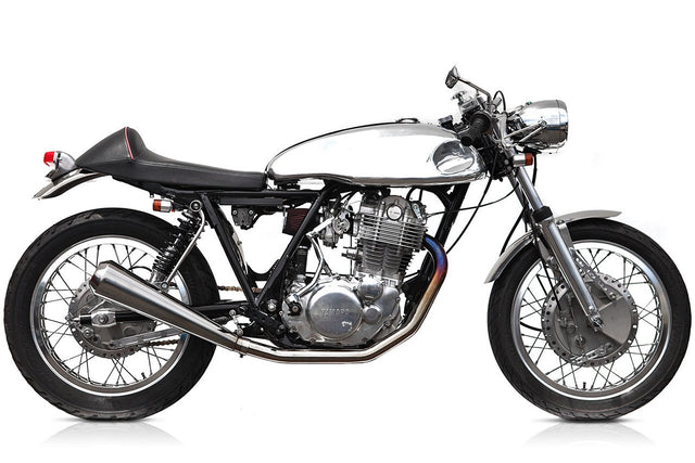 A blinding build this is, adopting Yamaha's SR400 as the platform. Grimeca replica four leading shoe front and twin leading shoe rear brakes are laced to mud catcher alloys. Tricked out with a Manx style alloy tank and 'vintage' headlight rests within the Daytona speedo. Full TT exhaust from pipe bending guru Denis Foran aids the flow of spent gasses from the Hi-Po big bore 525cc dyno-tuned single. A machine found on many a wish list.