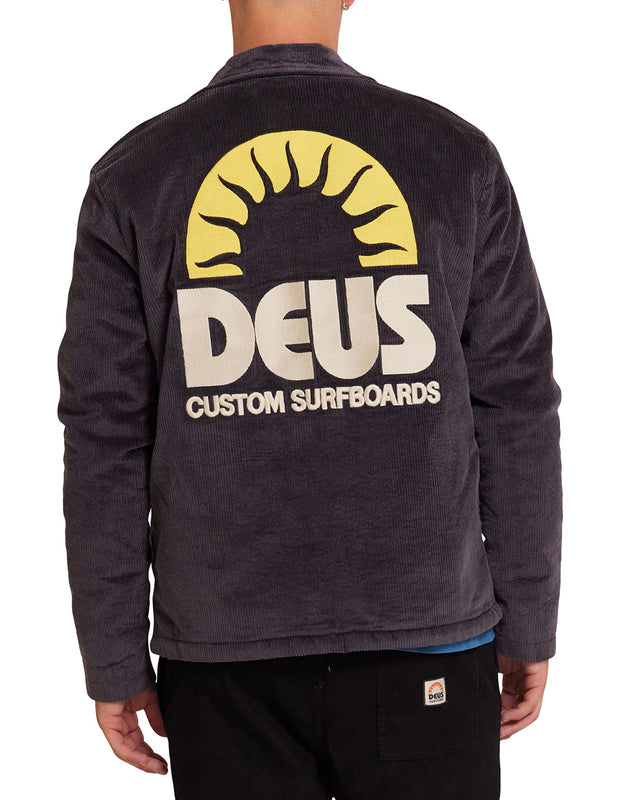 A relaxed-fit coach jacket with front and back embroidery. Sherpa fleece lining and heavy enzyme stonewash provide a lived-in look and feel straight out the box. The Stokes Coach Jacket features DEUS inscribed snap close buttons, drawstring hem, welt and interior pockets with a robust, cotton-elastane blend fabrication.